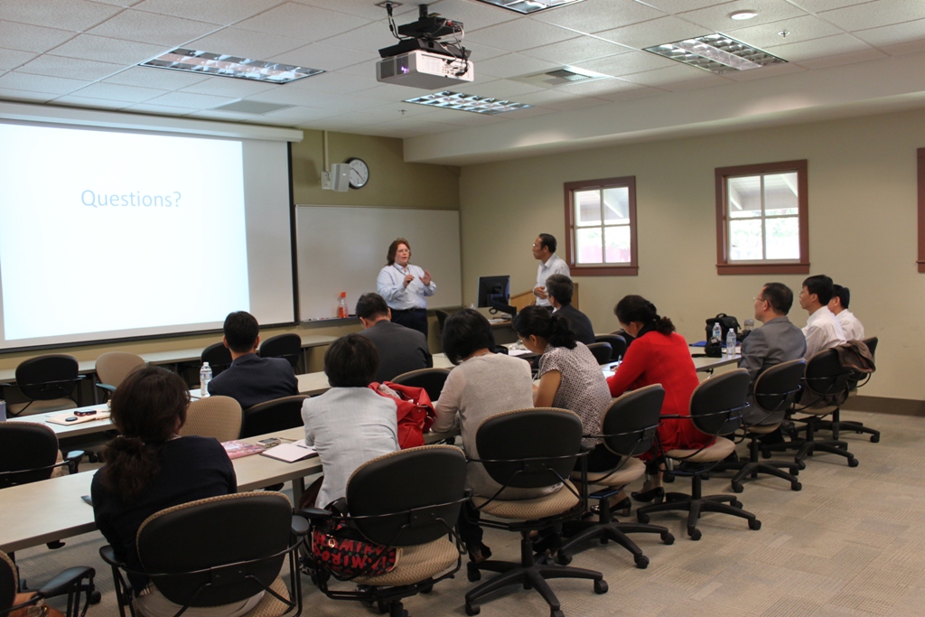 精彩的报告让团员们忘却了疲劳,第二天又精神饱满地听取了该校戴维斯分校人力资源部埃尔恩•汤普逊(Irene Horgan-Thompson)部长关于福利待遇、岗位管理和发展的专题报告。该校可持续发展中心主任、国际著名政治学教授拉里•伯曼(Larry Berman)教授就美国现有的政治体制、高等教育体制和高等教育的层次构成及办学特色、现状等问题,做了全面系统的解读,使培训团成员全景式地了解到当下美国的政治经济及高等教育状况。团员们珍惜每个学习机会,课堂上踊跃提问,和教授们交流热烈。