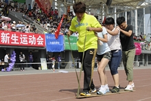 两条长长的木板,像是两排小小的竹筏在红色的湖面上向前滑行。“船头”一名男生掌舵,“船舱”“船尾”两名女生和一名男生配合着,他们或喊着“左,右”,或喊着“一,二”齐心协力向前走。赛场上比的是速度,拼的却是队员间的默契与配合,稍不留神,就有“翻船”的危险。计算机与信息学院四名同学分别身着紫色印有“计”“信”“冠”“军”字样的T恤,响亮的口号、统一的步伐,计信队伍稳稳地向前行进,最后竟然小跑冲过终点,轻而易举摘得桂冠。“我们之前用竹竿绑在腿上练了几天。我们练了,他们不练,第一当然是我们的。”计信两名队员兴奋地交流着成功的经验。 。