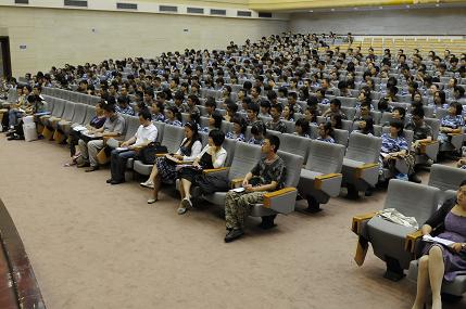 9月1日下午,经济学院召开2011级新生开学典礼暨学院领导与新生见面会。党总支书记李宝仁,院长杨德勇,副院长郭馨梅、李书友、马若微,各系主任、全体辅导员和班主任及2011级全体新生参加了大会。会议由学院党总支副书记马韬光主持。