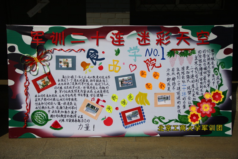 主席台前的21块展板,在军训的场地里鼓励着每一个连队,在评比的舞台上散发着青春的光芒。哈尼克孜和祖力皮亚制作的二十连展板“食品学院No.1”,因布局“整齐”得到了评委的青睐,在评比中荣获三等奖。