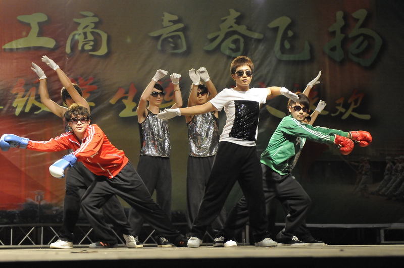 第一个登场的是军训团三营学员,他们带来的音乐剧《新的开始》,他们用舞蹈、朗诵、表演等形式,表现了从第一次踏入工商的欣喜,到对未来大学生活的期待。舞蹈还将街舞与擒敌拳、太极等相结合,非常有创意。最后,他们以军礼结束了表演,表达了对教官的尊敬,展现出青春最强者的风采。