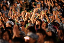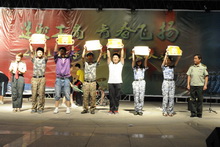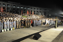 文艺演出开始,大屏幕上播放了2011级学生的军训生活录像。屏幕上同学们训练的点点滴滴,引起场下同学的强烈共鸣。伴随着隆隆的鼓声,六个军训营的营旗齐登场,击鼓表演《威风锣鼓》正式拉开演出帷幕。此时的台下,各营都在高声呐喊自己的口号,场面热闹非凡。