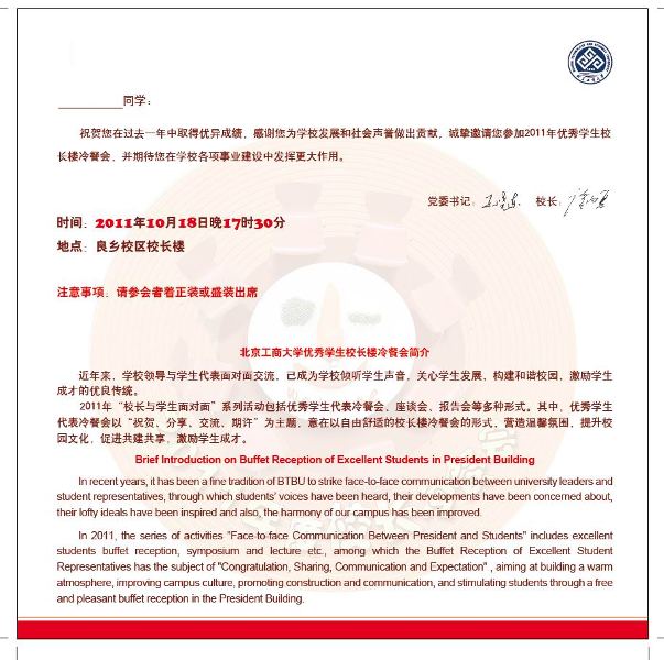 99日举办教学优秀奖教师冷餐会、928日举办科研优秀教师冷餐会后,1018日晚,学校在良乡校区举行2011年校长楼冷餐会系列之三——“优秀学生代表校长楼冷餐会”,冷餐会主题为“祝贺、分享、交流、期许”。50名在学业、科研、文体、社会工作等领域取得优异成绩的学生代表受邀参加(名单附后)。校领导孙尧东、谭向勇、卢思锋及有关职能部门负责人出席冷餐会,学校以这种高雅新颖的形式对取得突出业绩的优秀学生给予肯定和表彰。