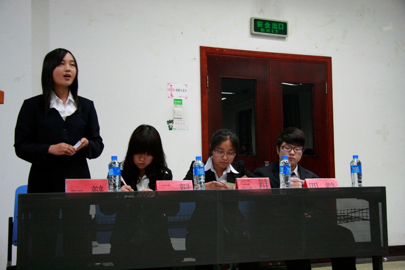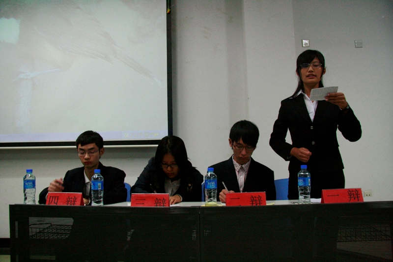 本次开幕战的辩题是“高等教育应该注重人格培训还是知识培训”。正方为外国语学院,他们支持的观点是“高等教育应注重人格培训多于知识培训”;反方为理学院,他们支持的观点是“高等教育应注重知识培训多于人格培训”。正方以当代出现的社会问题为例,引出当代社会人格缺失的现象,强调了人格的重要性;而反方紧扣高等教育、知识、人格等三词的定义,从个人、社会、国家三个方面由浅入深地论述了知识在高等教育中的主导地位。双方辩手各不相让,发言环环相扣,用掷地有声的语言赢得了全场一次又一次的掌声。