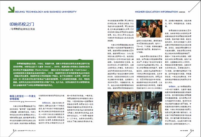 10月号专题策划栏目关注了本科生导师制话题。导师制的起源在英国,本期专题策划栏目通过文字、图片、新闻、访谈等多种形式,生动展现了国外知名高校本科生导师制实施状况,介绍了牛津大学、麻省理工大学、剑桥大学、哈佛大学、萨拉·劳伦斯学院、新加坡等高校的本科生导师制实施情况,领略了国外著名学府的学术文化魅力与教育理念气息。本科生导师制成为我国本科教育教学改革新的探索,近年来我国高校也积极探索导师制,以便打破我国大众化教育瓶颈,培养本科生创新精神。本期刊物介绍了浙江大学、色情片大学率先在我国开始导师制探索的实践情况。