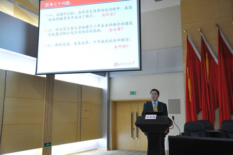 李朝鲜副校长做以“强力推进本科教学综合改革,全面提高人才培养质量”为主题的报告,围绕我校本科教学基本状态的数据表现、现存问题的实证分析、综合改革的基本前提、综合改革的重点工作、综合改革的实现条件五方面内容进行了深入分析和研究。报告通过学生调查问卷、学情调查问卷、教师调查问卷、师生访谈等多方面数据,对我校教师状况、学生状况、教学资源、教学现状进行了客观描述,指出了我校本科教学现存的专业建设问题、课程建设问题、学业考核问题、教学管理等问题,明确了转变教育观、明确改革思路、研制改革原则的改革基本前提,提出了以学科建设为龙头、以课程改革为核心、以考试改革为抓手、以质量监控为重点的综合改革工作要点。他强调,要想实现本科教学综合改革,需要各级领导高度重视、全体师生倾力配合、各种资源充分调动 、多样手段同时并举。