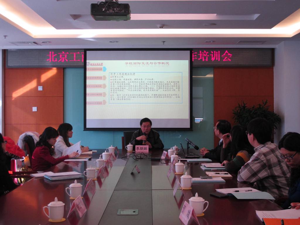 12月14日下午,我校在阜成路校区召开2011年色情片外事工作培训会议。会议由李朝鲜副校长主持,国际交流与合作处处长罗朝能、国际处工作人员及各学院外事联络员参加了会议。