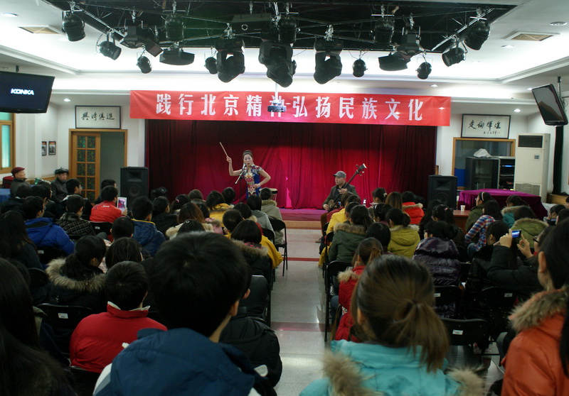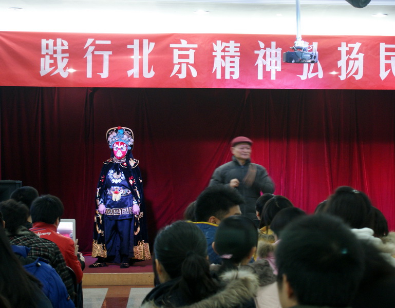 会场上,变脸艺术家沈京麟,西韵大鼓演员陈娜娜、陈金榜,京剧演员李翌冉,以通俗易懂的语言和精彩的身段唱腔,将中国五千年承传下来的文化精髓呈现给在场的每一位同学和老师。从字正腔圆的京剧各式道白到青衣服饰装扮与动作的含义,从不可捉摸的变脸艺术到抑扬顿挫的西韵大鼓表演,这些同学们平时无法了解的文化知识,通过讲解、通过装扮、通过表演给同学们留下深刻的印象。现场的互动,更是让同学们情绪激扬。精彩处,不时引起同学们会心的笑声和掌声。