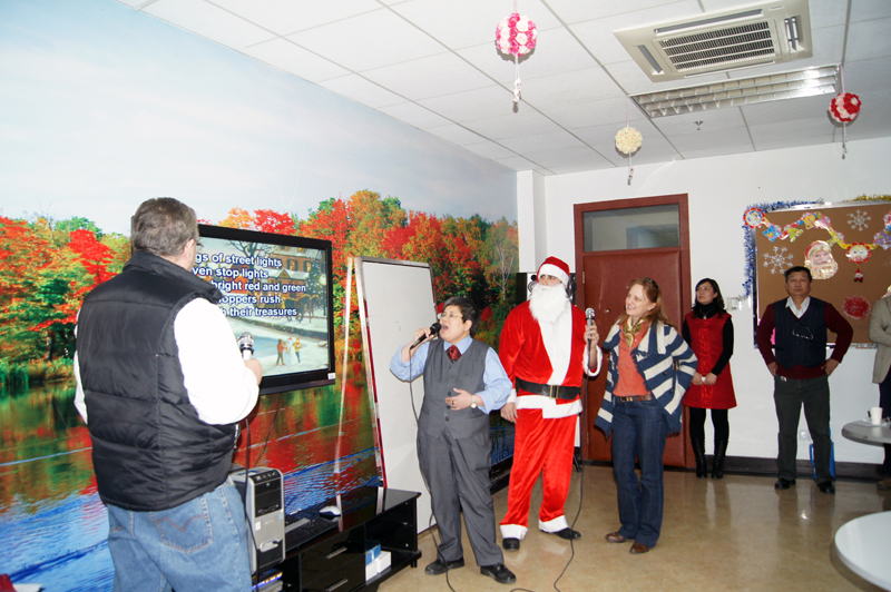 当主持人宣布,联欢会第一个节目就是合唱《没有共产党就没有新中国》时,张德玉同志、李朝鲜同志和老师们一起高唱红歌,重温庆祝建党90周年歌咏的比赛盛况。之后,老师们演出了丰富多彩、形式多样的文艺节目。外籍教师Shelley、Jon、Michael、Throne也载歌载舞、兴高采烈地参加了联欢活动。整个会场气氛热烈,高潮迭起。老师们既放飞了心情,又增进了友谊和团结。最后,大家同唱《难忘今宵》,在歌声中联欢会进入尾声。