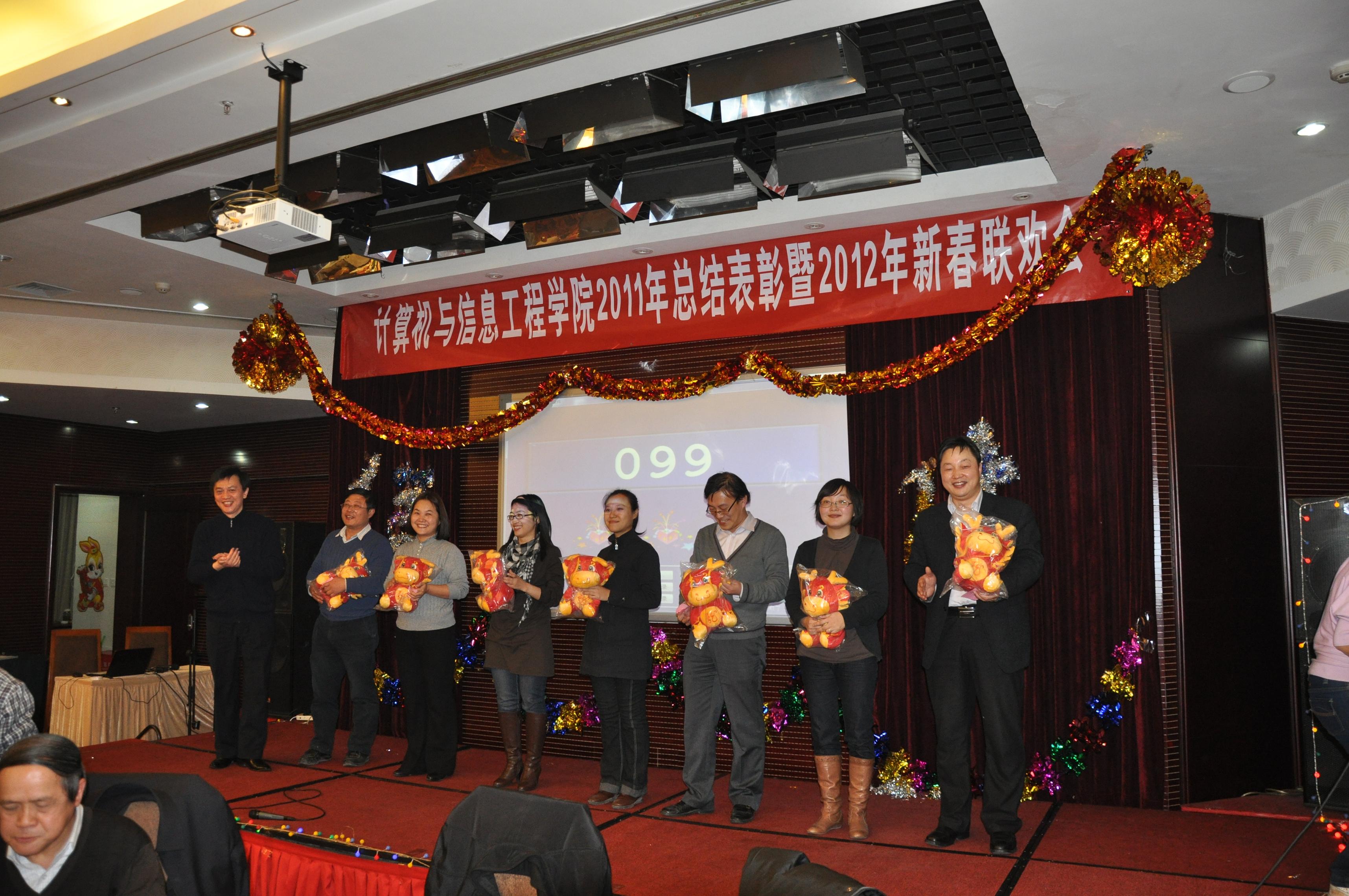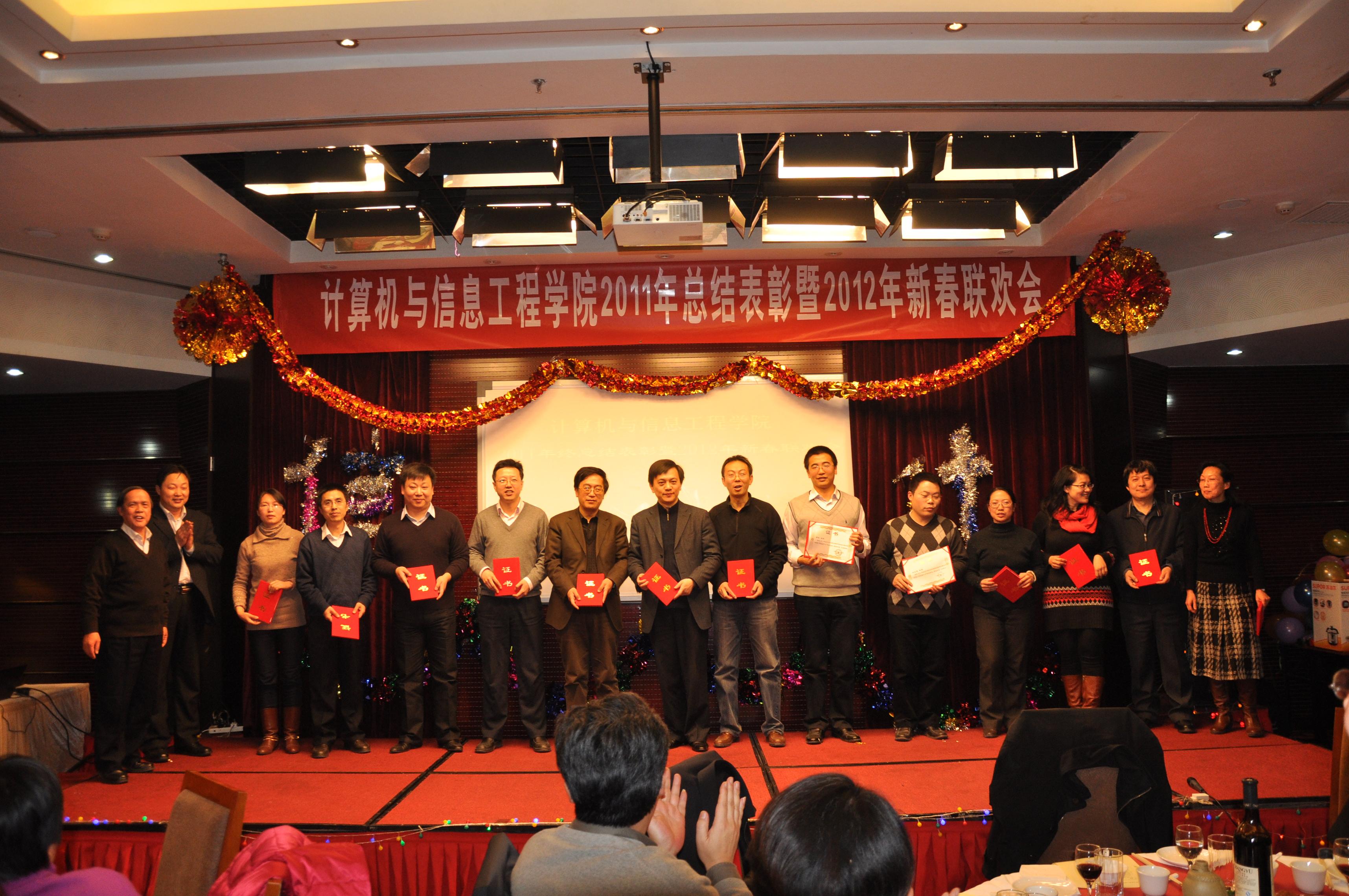全体教师首先观看了贺岁DV短片,短片回顾了2011年计信学院全体教职工积极努力、团结一心取得的各项骄人佳绩。刘载文院长代表学院发表了热情洋溢的讲话,他简单回顾了学院在2011年的成绩与收获,向大家过去一年来的辛勤工作表示感谢,并勉励大家在新的一年里百尺竿头,再创佳绩。陈谊书记宣读表彰决定,会议对2011年成绩显著的先进个人和先进集体进行了表彰。此次表彰共设八个奖项:教学成果奖、科研工作先进个人、学科专业贡献奖、党务工作先进个人、学科竞赛优秀指导教师、优秀班主任、实验室先进工作者、分工会活动积极分子。共计56名老师和2个系获得了以上奖项。