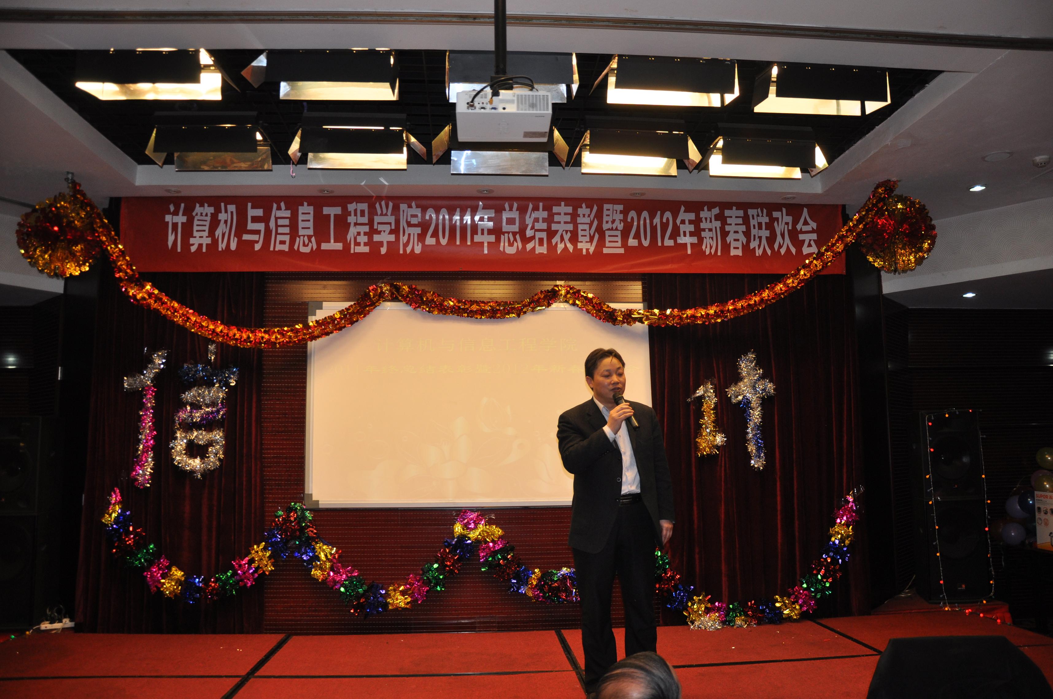 2011年12月30日晚,计信学院全体教职工欢聚一堂,举行2011年总结表彰会暨新年联欢会。副校长方德英、校工会主席韩宝龙、网络中心主任刘翠玲、研究生处副处长莫倩、科技处副处长王小艺应邀出席了表彰联欢会。