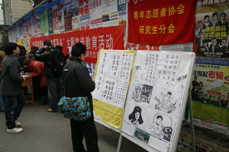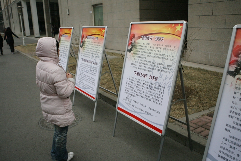 为了更全面更准确地诠释雷锋精神,研究生部团总支成员积极筹划,广泛搜集资料,精心制作了诠释不同时代雷锋精神内涵展板共计10块,在东区双子楼下展出。内容从上世纪60年代,向雷锋学习的活动席卷全国,“雷锋”成为一切美好事物、真善美的象征。70年代,就像《学习雷锋好榜样》里唱的那样,“忠于革命忠于党,爱憎分明不忘本……”“忠诚”和“爱憎分明”备受关注。80年代,改革开放,百废待兴,“做一颗永不生锈的螺丝钉”的钉子精神,为时代推崇。到90年代,雷锋精神被解释为“全心全意为人民服务,为了人民事业无私奉献”的奉献精神。同时,还搜集展出了“当代雷锋”——郭明义、“天安门广场义务保洁员”——刘玉珍等同志的优秀事迹。现场观看的师生在全面了解雷锋精神内涵的同时,嘴里亦不吝对雷锋精神的溢美之词。
