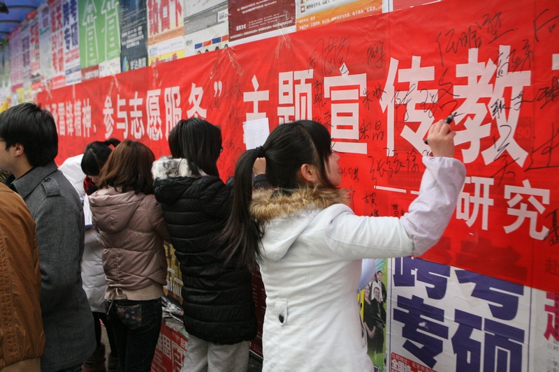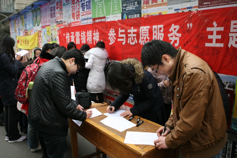 为响应学校 “学雷锋、树新风——2012年大学生志愿服务行动”号召,研究生部团总支在东区食堂门口专门设计了条幅签名活动。每位驻足参与活动的同学都在条幅上郑重签下自己的名字,意味着大家发出了“从小事做起,投身志愿活动”的行动宣言。红色的长条幅、端庄的文字,不仅是本次活动的宣传口号,更是“雷锋精神”的代表。一位受访同学谈到:“无论社会多么浮躁、功利之风如何盛行,对助人为乐、与人为善等道德价值的弘扬不能放弃,从小事做起,从身边做起,积极投身志愿行动和公益活动是传承新时期‘雷锋精神’的最佳途径。”