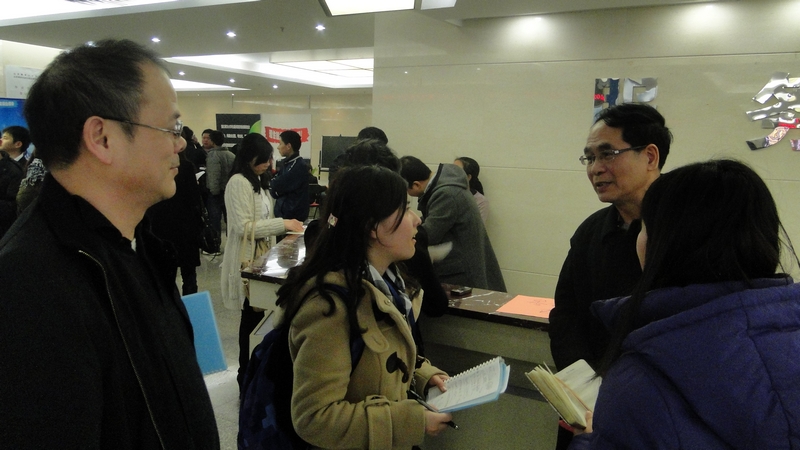 理学院、食品学院、材料与机械工程学院、计算机与信息工程学院、经济学院、商学院等学院的负责人也来到会场。有的同学一见到老师,就倾诉起了自己的面试心情,寻求帮助。材机学院马春晖副书记介绍:“我们学院老师也会与相关单位进行交流,还会回访录用我院学生较多的单位。我们指导最终目的就是千方百计帮助学生。建议同学们与用人单位多沟通,多投简历以获得更多就业机会。”