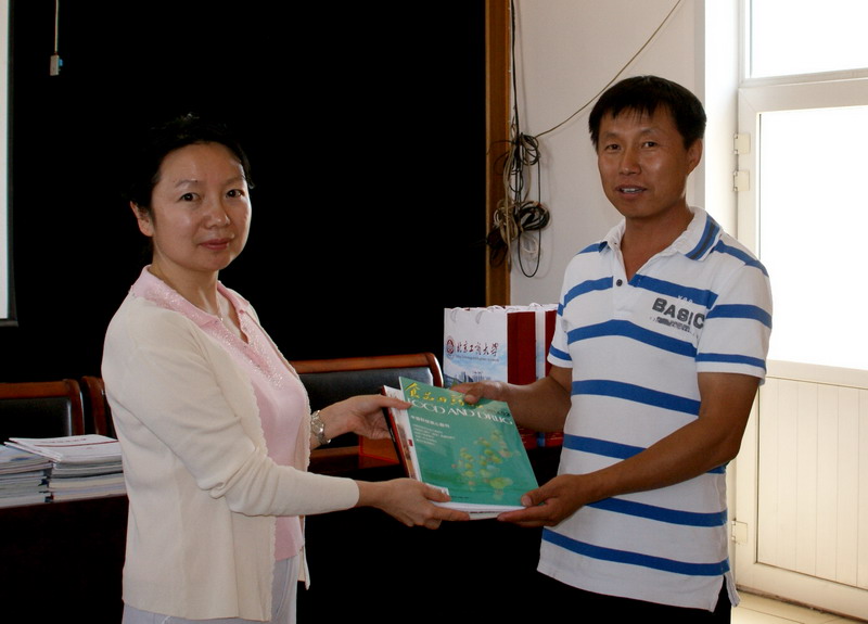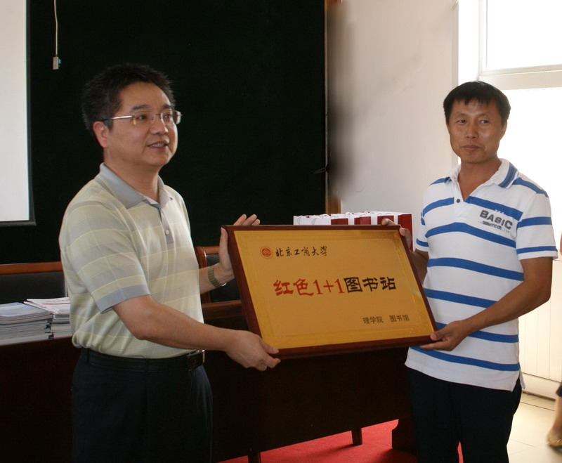 随后进行的是红色“1+1”图书站启动仪式。此前,学校图书馆、理学院多方筹集适合本次活动的书籍,共捐赠了关于新型农村建设、财富类以及农业专业知识类图书200余本。马春晖馆长在讲话中表示,非常高兴能够与理学院和南河村一起开展此项活动,希望借此机会能为村民提供一些技术上的指导和帮助,同时也非常愿意在今后的日子里继续大力支持图书站成长,提供更多更好的书籍,让更多的农民朋友们受益。