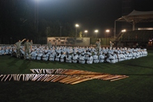 夜幕降临,同学们这一天的任务却并未结束,一个小时的休息时间后伴着嘹亮整齐的口号声,他们又回到训练场继续训练。随后教官表演则让同学们轻松了不少,孔武有力的擒敌拳和优美的军歌让劳累了一天的同学们身心都得到了放松。