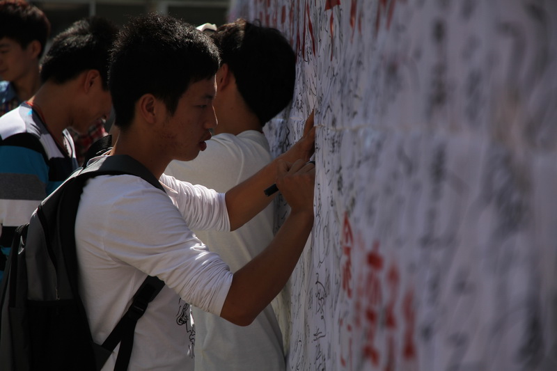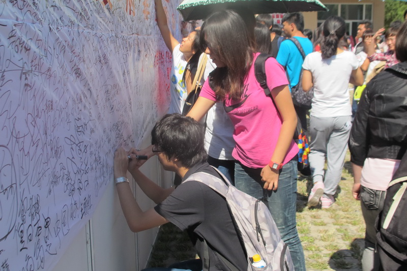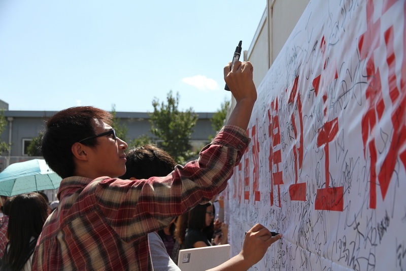 在阜成路校区和良乡校区的签名现场,一侧陈列着我国政府和各社会团体关于钓鱼岛问题的声明、九·一八事变和钓鱼岛是中国固有领土的史实资料展板,一侧悬挂着白色布幔横幅:“勿忘国耻,捍卫主权,振兴中华,从我做起”、“钓鱼岛是中国固有领土,强烈抗议日本政府非法购岛!”学生们纷纷在横幅上表达自己的心声以及签上自己的名字: “钓鱼岛是中国的,捍卫中国领土完整”、“钓鱼岛是中国固有领土”、“还我钓鱼岛”等留言强烈地表达了大家的爱国之情以及对日本的极右翼势力的愤懑之情。