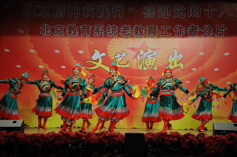 文艺演出由我校老教育工作者姚振声、李华共同主持。来自中央民族大学等14所高校的220多名老教育工作者登台献艺,演出了管乐、合唱、舞蹈、时装、独唱、重唱、京剧等17个精彩纷呈的节目,赢得观众一致喝彩。参与本次演出的老教育工作者平均年龄近70岁高龄,但是他们精神面貌却如青松翠柏,节目体现出他们对党的无限深情,展现了他们幸福多彩的晚年生活。舞台设计、背景、音响、灯光和环境布置烘托出了欢乐、喜庆、祥和的气氛。