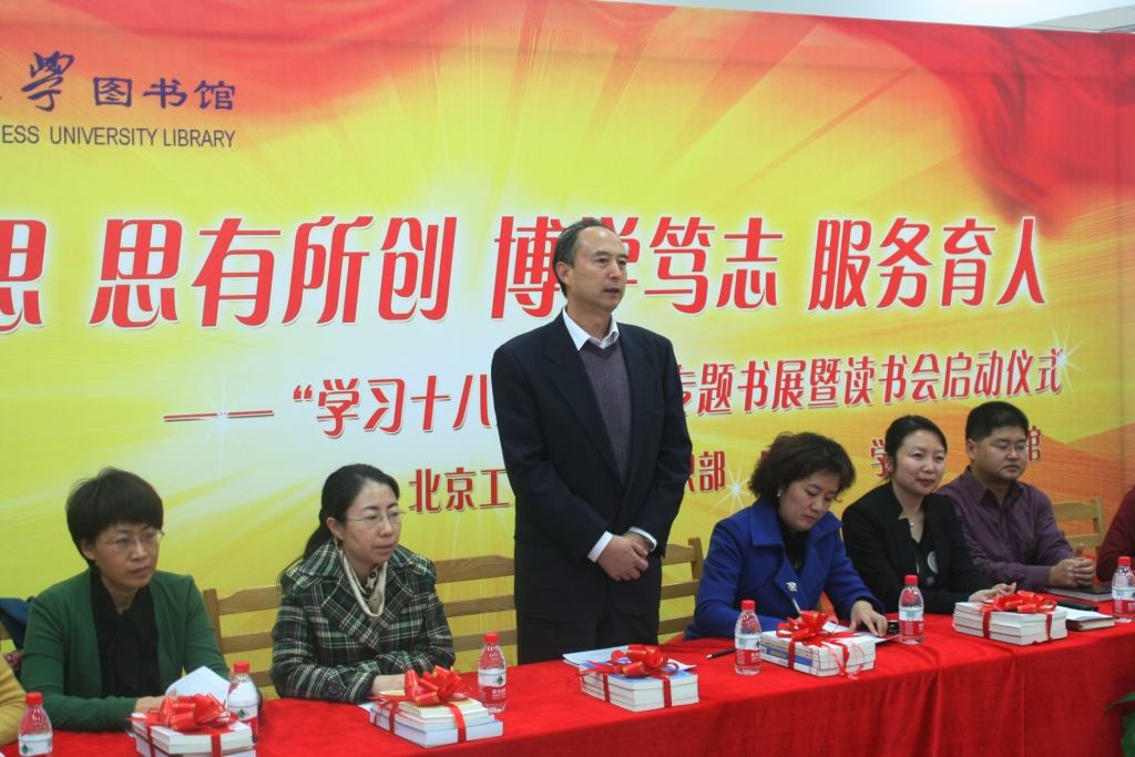为认真贯彻落实“十八大”会议精神、热情讴歌党的光辉业绩、加快推进学习型基层党组织建设、引导师生多读书、读好书, 11月20日下午,图书馆在阜成路校区举行了以“读有所思、思有所创、博学笃志服务育人”为主题的“学习十八大精神”专题书展暨读书会启动仪式。学校党委副书记卢思锋、组织部部长兼机关党委常务副书记董竹娟、宣传部部长张春萍、学生处处长吕素香、组织部副部长兼机关党委副书记郑喜姣、图书馆全体共产党员及学生代表参加了启动仪式。仪式由图书馆党支部书记李艳芬主持。