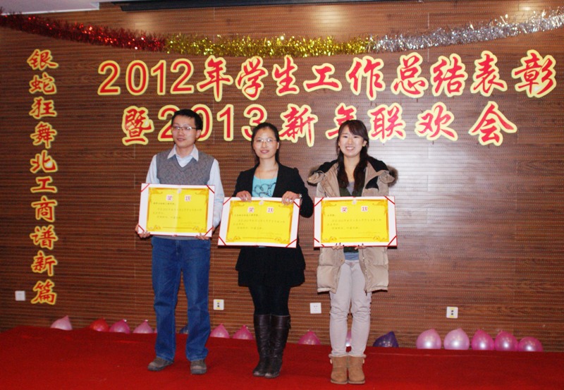 金龙腾飞辞旧岁,银蛇狂舞庆新年。1月10日,学生处在阜成路校区隆重举行2012年学生工作总结表彰暨2013年新年联欢会。除学生工作系统全体教职工外,此次联欢会还特意邀请到了学校办公室、党委组织部、教务处、研究生部、人事处、后勤管理处、保卫处、体育与艺术教学部、图书馆、校医院等职能部门的相关领导参加,充分体现我校“大德育”的工作格局。大家欢聚一堂,载歌载舞,共同回顾2012年走过的光辉岁月,畅想2013年的美好未来。