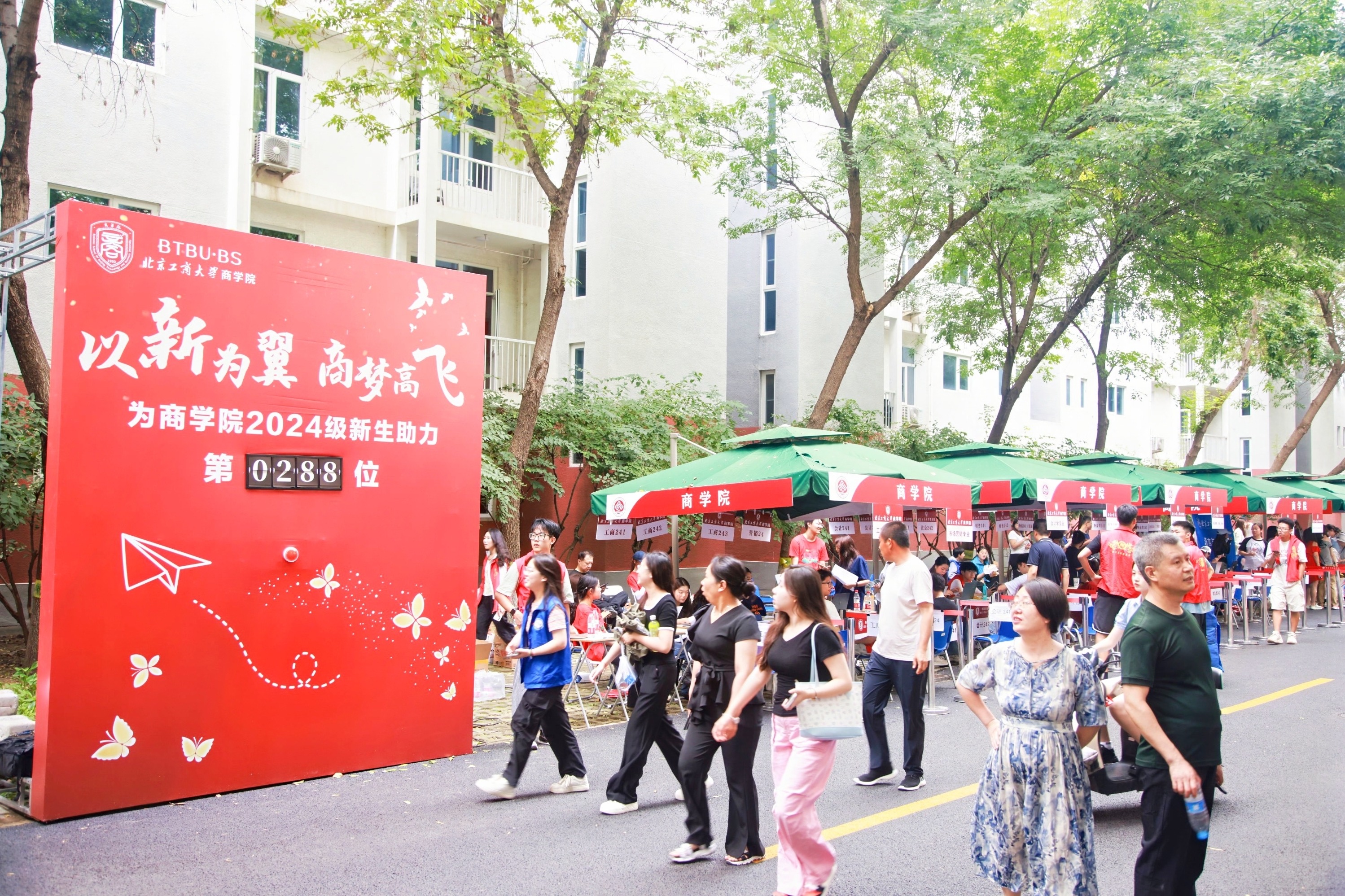 商学院设计布置了印有611名新生名字的“2024”创意签名墙和个性报到拍照墙,这将成为他们大学生活的第一个独特印记!商学院向每一名新生发放自主设计定制“商院红”院服院徽,让所有新生烙上北工商商院烙印。