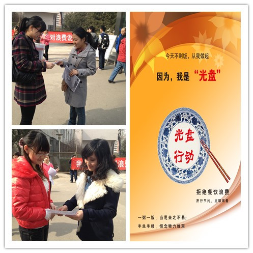 3月5日,食品学院团总支在阜成路校区东区食堂举办“学雷锋 爱环保——今天不剩饭从我做起”活动,号召大家勤俭节约。无论是精心设计的主题为“光盘行动拒绝舌尖上的浪费”的海报,还是在食堂门口向全校师生分发的号召 “光盘行动”的宣传单,都在温馨地提醒大家拒绝浪费,形成人人节约粮食的良好校园风气。此外还号召大家发扬节约粮食的优良作风,从我做起,天天不剩饭。