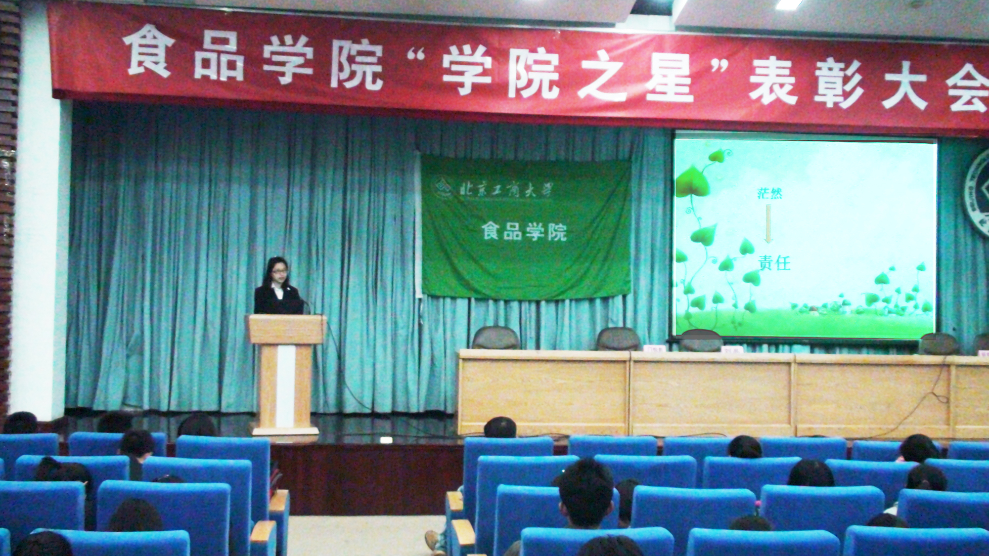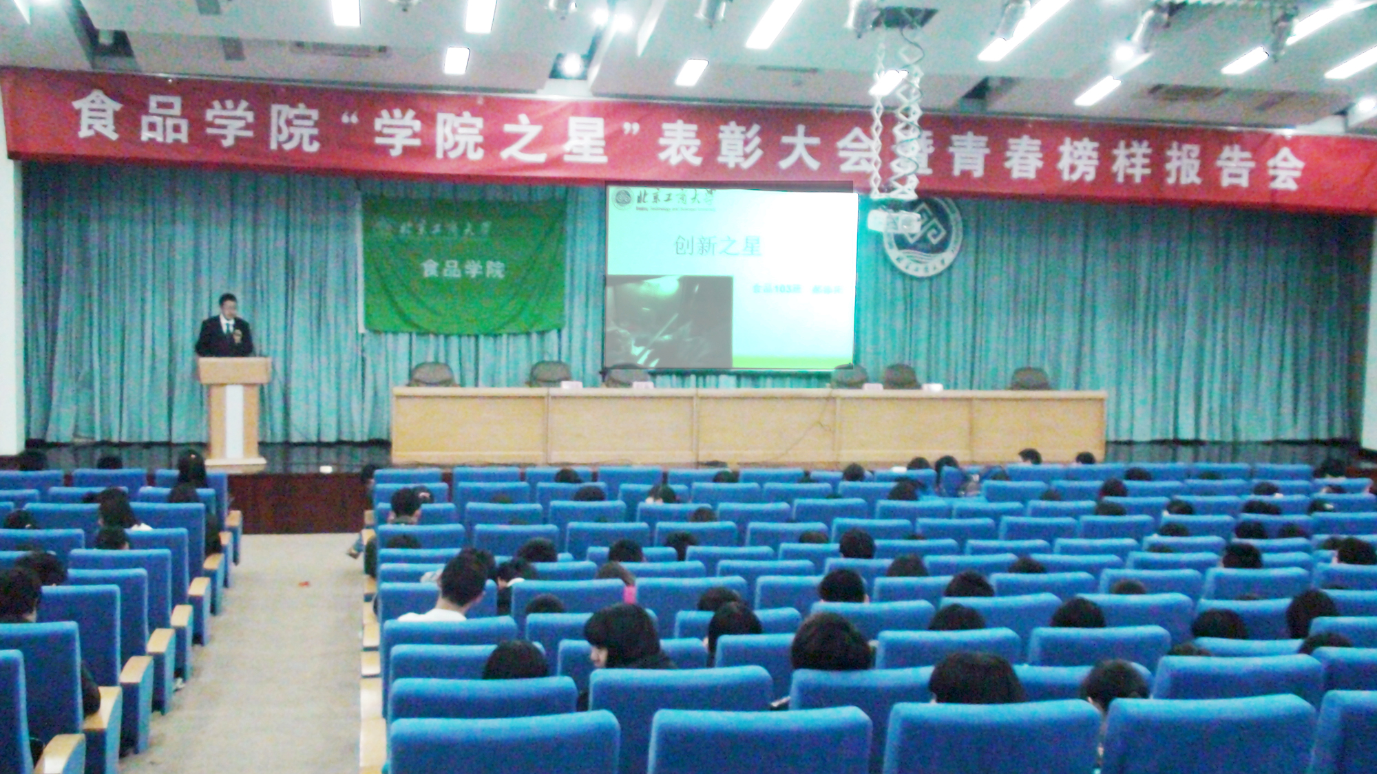 4月17日下午,食品学院在良乡校区举办“我的梦•中国梦——食品学院‘学院之星’表彰大会暨青春榜样报告会”。通过“学院之星”代表讲述自己或身边人为实现个人发展、推动社会进步、建设美丽色情片而学习成才、奉献创新、不懈奋斗的感人故事,增强学生中“青春榜样”的力量,将“我的青春梦想”融入到“中国梦”的实践当中。食品学院党总支副书记胡燕霞、团总支书记、辅导员以及2012级学生200余人参加了报告会。
