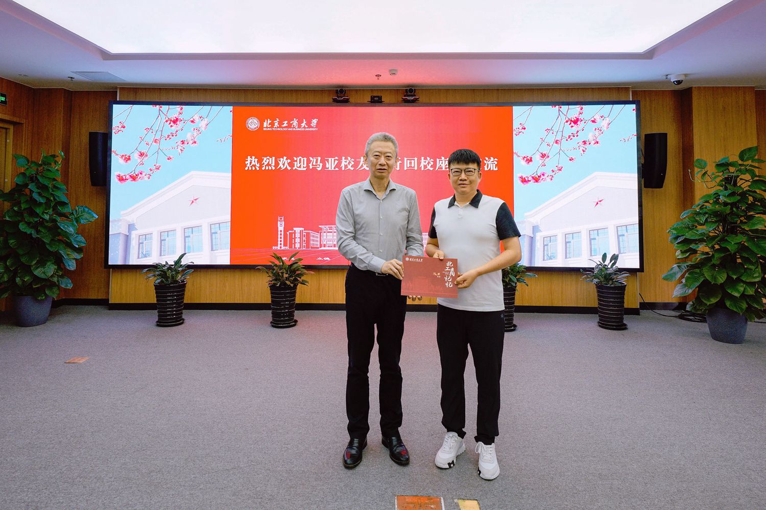 党委书记沈千帆为冯亚校友颁发《北工商记忆画册》,对冯亚校友心系母校,长期关注和支持学校发展建设表示衷心感谢,介绍了学校近期发展思路和取得的成绩。他谈到,学校锚定高水平研究型大学办学定位,坚持以“工商一体化”理念为引领,以“双一流”学科创建为抓手,各项事业发展态势良好,综合排名持续攀升。学校发展既得益于老师们的辛勤工作,也离不开校友和社会各界的支持。冯亚校友从产业发展视角分析科技创新,各位教授们结合研究新成果畅谈产业融合,这种“学术界+产业界”的对话和交流,不仅拓展了大家的视野,深化了对前沿科技的了解,也为校企合作开辟了新模式。希望冯总常回学校,祝愿德信汇富公司越办越好,期待校友与学校相互借力,拓展合作,协同创新,共同发展。
