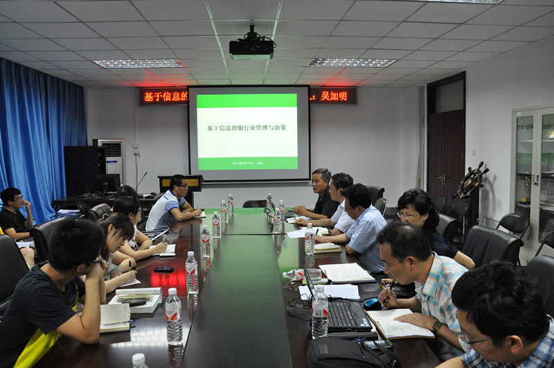 6月19日晚,应副校长方德英的邀请,中国民生银行信息管理中心高级经济师、总经理高级助理吴加明先生来到我校计信学院做了题为”基于信息的银行业管理与决策”的报告。副校长方德英出席并主持了报告会,计信学院院长蔡强、党总支书记陈谊、副院长姜同强及部分教师和研究生参加了会议。