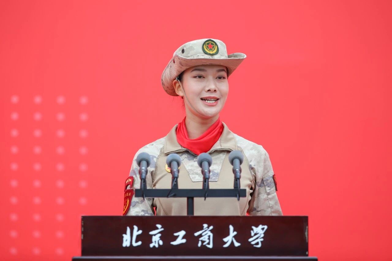 法学院退伍大学生陆俊卉作为在校生代表,分享了作为民兵方队队员参加九三阅兵的珍贵经历。她动情回顾了193天高强度的队列训练的艰辛与坚持,并表示,是伟大的抗战精神和师长的支持让她最终昂首走过天安门。她结合自身从军人到学生的转变,阐述了当代北工商学子应具备的四种风采:心怀家国的爱国情怀、坚守诚信的民族气节、迎难而上的英雄气概和融通发展的必胜信念。她呼吁学弟学妹们珍惜时光、自律自强、勇于挑战,将“工商一体化”的理念转化为综合竞争力,在实现民族复兴的赛道上奋力奔跑。