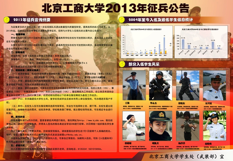 为征集更多的应届及在校大学生入伍,从2013年开始,国务院、中央军委决定由以往的冬季征兵调整为夏季征兵。6月17日起,我校全面启动了今年的大学生入伍报名工作。学生处开展了“入伍宣传周”系列活动,通过征兵海报、入伍宣传手册、短信平台、互联网、微博、“退伍老兵事迹报告会”、部队参观等多种渠道大力宣传征兵政策。截至7月4日,我校共有61名男生、28名女生积极报名,其中大一19人、大二16人、大三27人、大四24人、研究生3人,报名总数是历年来最多的一次,尤其应届毕业生报名人数较以往明显增加。