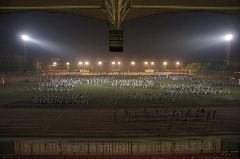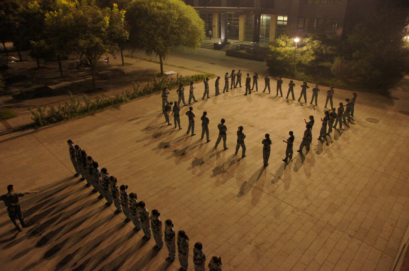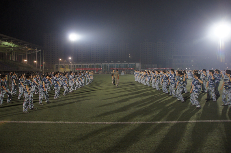 一大早,同学们练习站军姿、敬军礼,月光下,同学们学起了刺杀操、警棍盾牌术、军体拳。一天下来,没有人喊苦,也没有人喊累。大家认真的态度和刻苦的训练得到教官们的好评。同学们还在教官们的组织下热情饱满的唱起了大学生军训之歌,响亮的歌声代表了每个人对于顺利圆满完成军训的坚定决心。