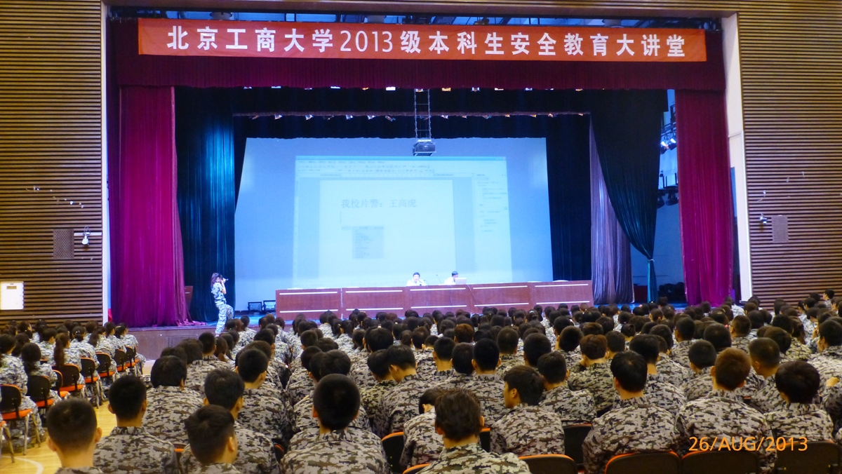 8月27日,良乡派出所管片民警王高虎在保卫处副处长杨东杰的陪同下,在良乡校区文体馆对全体参训新生3000人进行了一次治安安全的讲座。王警官分析了良乡大学城周边的治安环境,分析了近几年大学城学生的违法犯罪特点及原因,警示新生要珍惜生命,提高警惕,自觉做好治安防范工作,做遵纪守法的模范。杨东杰从防盗、防诈骗、防治安事故的角度分析了近两年学校典型的治安案件,并警告大家要自觉提高治安防范意识,群防群治,防止盗窃、打架、诈骗等治安事件的发生。