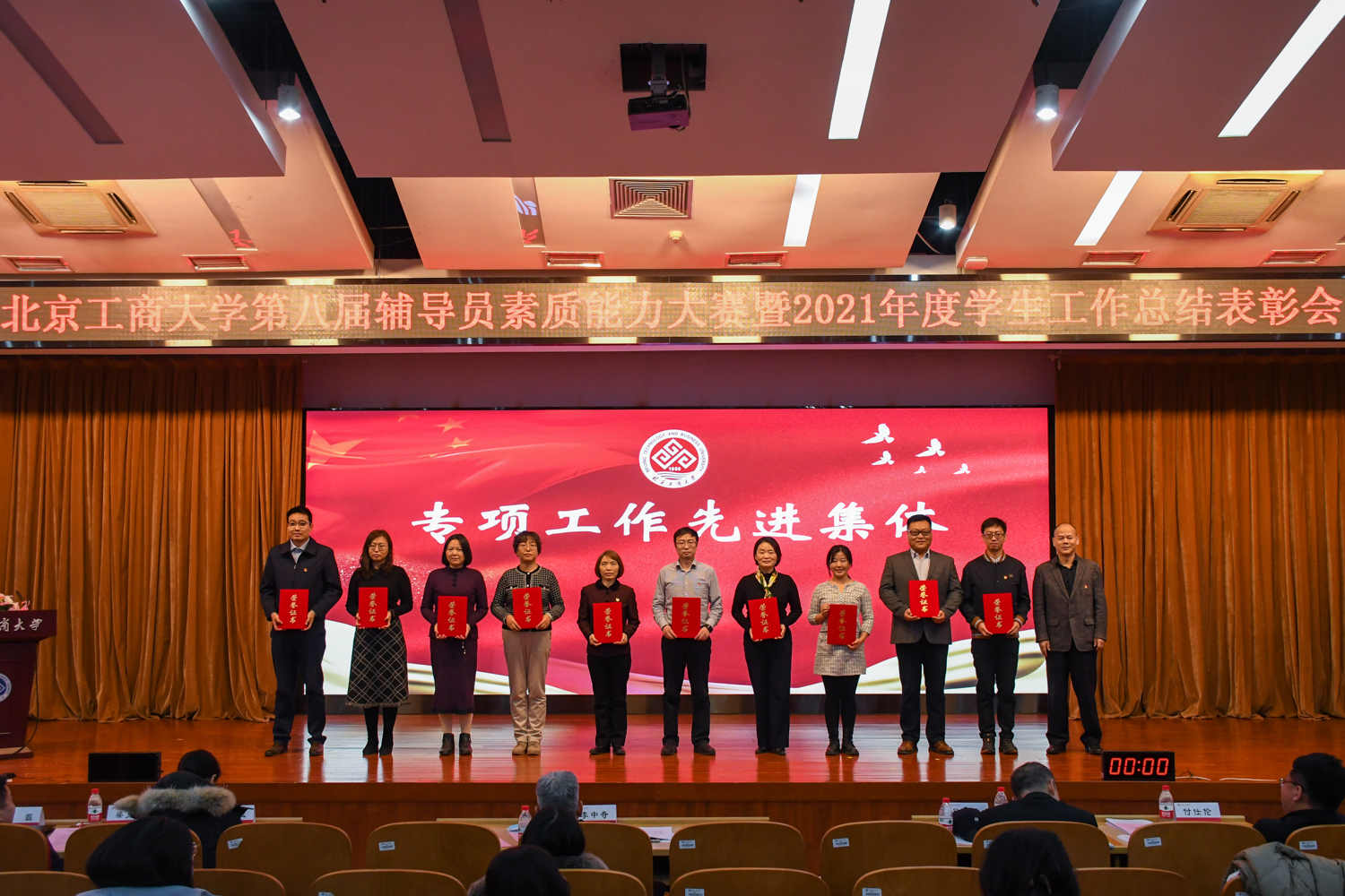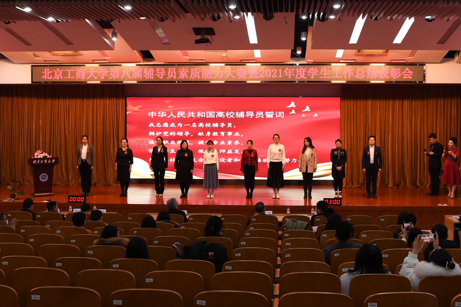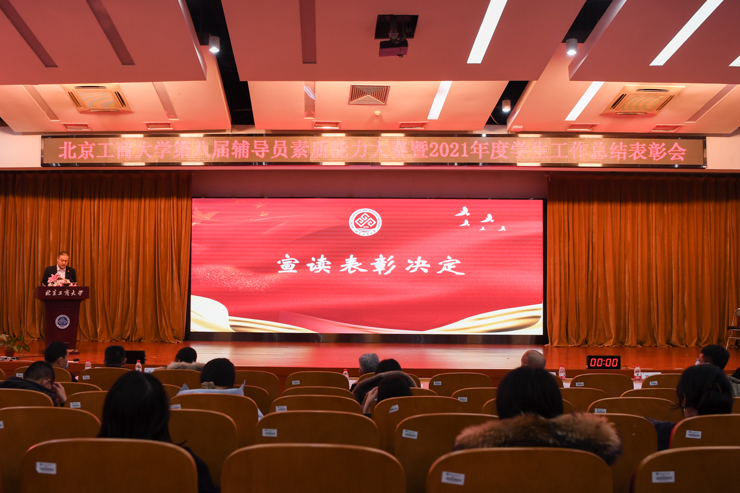 1月18日下午,学校在良乡主校区召开2021年度学生工作总结表彰会暨第八届辅导员素质能力大赛。校党委副书记李中奇出席会议。党委宣传部常务副部长何猛、招生就业处处长杨林、学生处处长吕良、团委书记付仕伦、公共事务处副处长(主持工作)梁克勇、保卫处副处长(主持工作)孙磊,以及各学院副书记、全体辅导员、班主任代表、学工及研工部门工作人员参会。