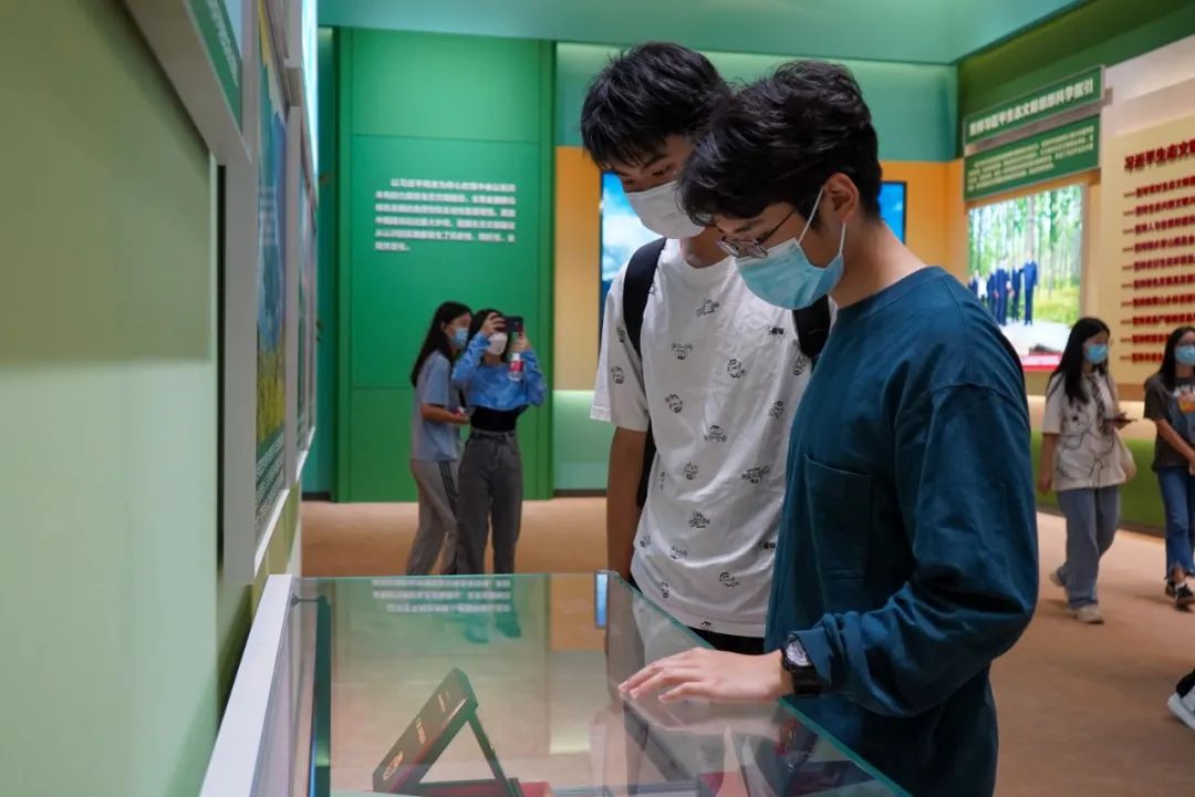 国庆70周年庆祝活动彩车微缩模型、数字中轴线沉浸式互动体验、带着高温灼烧痕迹的神舟十二号返回舱、能够纵览大湾区地理风貌和重大地标性建筑的粤港澳大湾区沙盘……一件件精致的实物模型、一幅幅生动的照片、一个个翔实的数据图表,吸引师生们频频驻足观看并拍照留念。