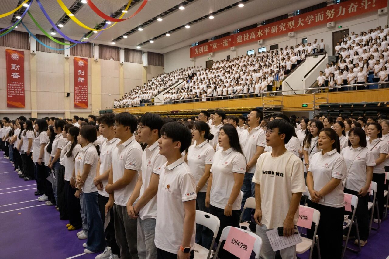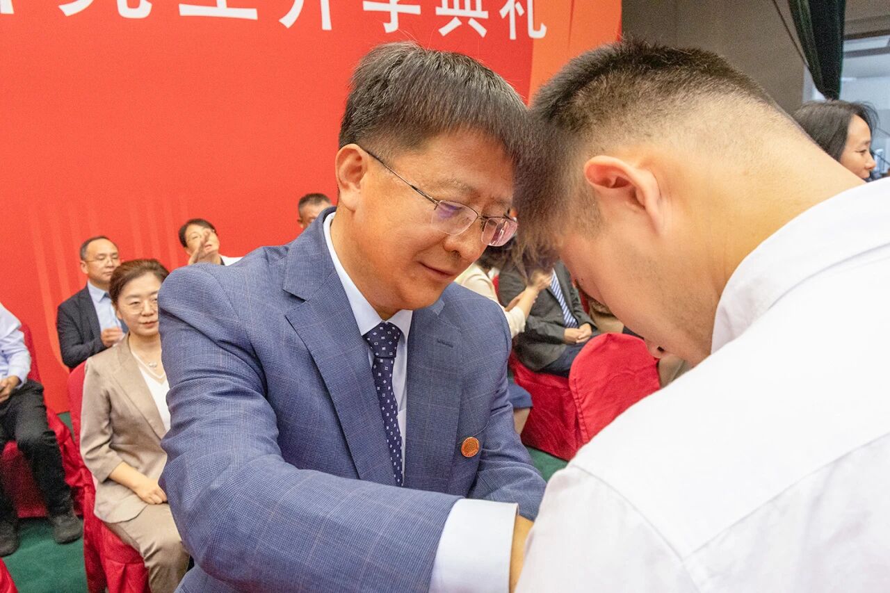 党委书记沈千帆,党委副书记、校长郭建华为新生代表佩戴校徽,全体新生同时起立,将校徽郑重佩戴于胸前。学校为每位研究生新生印发校歌曲谱,“求真、立德、勤奋、创新”的校训精神,将在2025级学子的身上得到新的传承,焕发新的生机,汇聚新的时代力量。