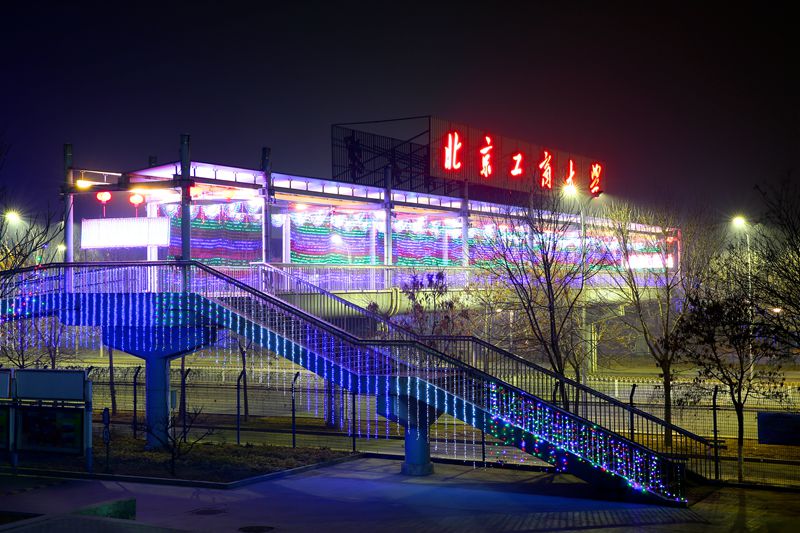 记者从负责校园装扮的后勤管理处了解到,今年是学校第三年进行校园装扮,后勤管理处12月14日开始具体布置,工作人员们不畏严寒,加班加点,历时10天基本完成两校区的装扮工作,并根据实际效果不断完善。此次节庆彩灯寓意百花盛开,蓝色与“中国梦”的主题契合。良乡校区主要是根据“两点一线”思路来设计,两点即为行政楼以及文体馆前的建筑,一线为连通教学区和生活区的天桥。自彩灯装扮完成以来,许多师生纷纷驻足于此,合影留念,感受着学校为大家准备的惊喜与温暖。