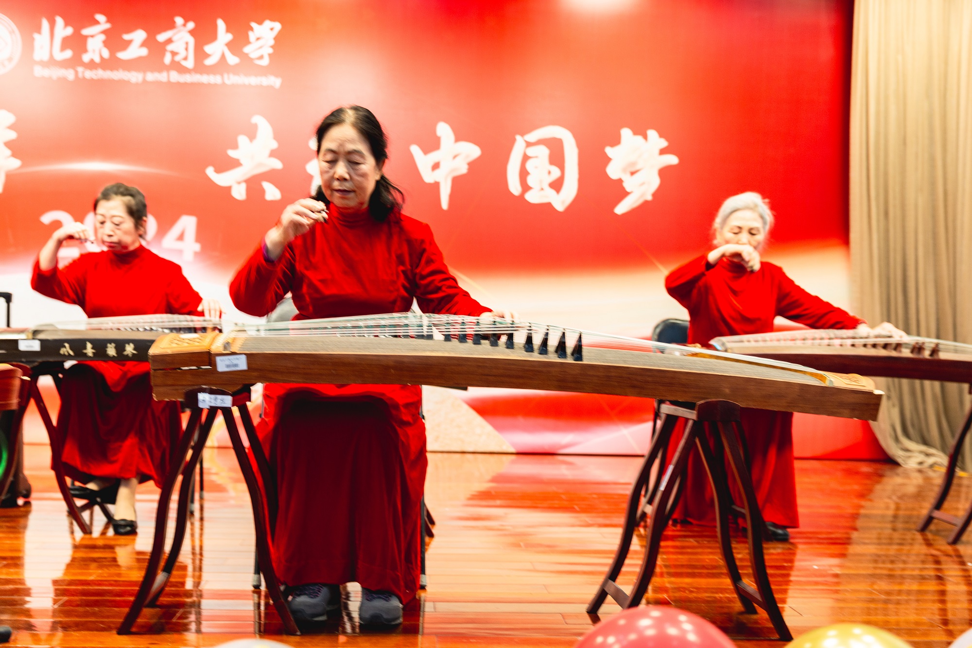 由学校退休教职工文艺团体表演的节目将团拜会带入欢乐庆祝的热烈氛围。管乐合奏《我的祖国》《拉德斯基进行曲》展现了人民对祖国的热爱和携手并进新征程的雄心壮志;古筝合奏的《荷塘月色》、葫芦丝合奏的《竹林深处》《婚誓》反映了人们对幸福生活的赞美和向往;大合唱《看山看水看中国》《春风十万里》让大家在歌声中领略祖国大好河山,传递出对祖国的无尽的爱意;《难忘的那一天》《洗衣歌》两支舞蹈展现了在祖国大家庭中,各族人民像石榴籽一样紧紧抱在一起,不断筑牢中华民族共同体意识;京剧名段联唱、时装表演《雨巷佳人》、健身项目表演《我爱你中国》展现了京剧、太极、民俗等中华优秀传统文化的魅力,传递出老同志积极向上的生活态度;书画社老同志现场泼墨挥毫,书写传统春联为大家送上祝福。整场演出带给老同志们欢快、关怀、自信的节日氛围,让老同志们更加有了归属感和幸福感。