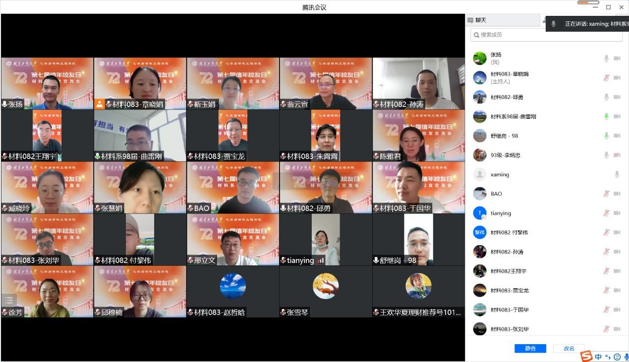 化学与材料工程学院召开材料科学与工程系校友交流会,邀请校友相聚云端。吕东燕、学院领导、教师代表等44人参加会议。材料系主任张扬教授介绍了该系的发展建设成果,校友们在逐一介绍后,围绕着母校和学院教学、科研、育人等热点话题展开了讨论,建言献策,助力学校、学院发展。