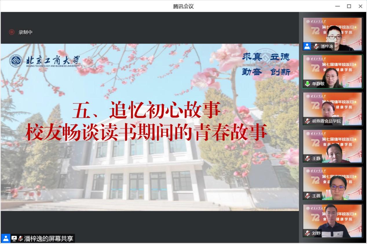 食品与健康学院举办“赓续初心,聚力行远”校友“云返校”活动。学院领导班子成员、校友代表、师生代表50余人共聚云端,畅谈交流,重温母校情谊,共忆青葱岁月。在“追忆初心故事”和“传承校友力量”环节,校友们畅聊读书期间的青春故事,分享学习、工作、生活的感悟和收获。