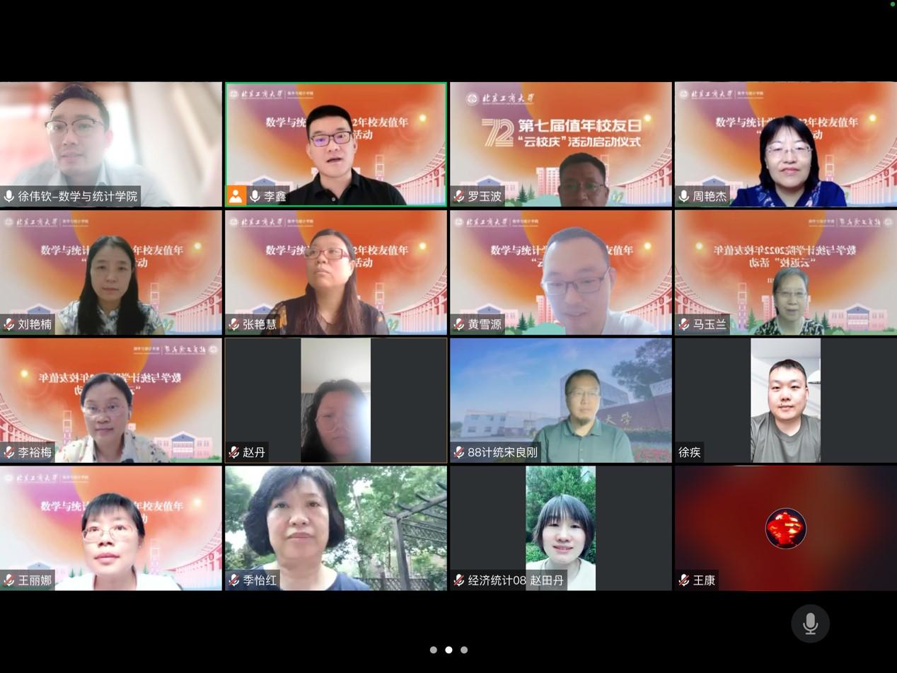 数学与统计学院邀请了计统88、信计08、统计08的值年校友及时任班主任线上相聚。学院全体领导班子成员、特邀嘉宾教务处处长曹显兵等出席会议,通过在线交流,与校友们共叙师友深情,共享美好时光。