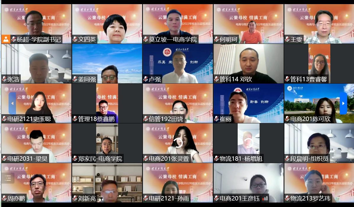 电商与物流学院开展了以“云聚母校,情满工商”为主题的校友“云返校”活动,电子商务、物流管理、信息管理与信息系统、工业管理工程、仓储运输、经济信息管理和管理科学与工程专业校友齐聚云端,共同观看学校宣传片,一同唱响校歌,重温青春岁月,畅聊深厚情谊。左敏出席会议,何明珂等教师代表、校友代表,学院领导班子、青年教师代表及在校生代表等近200人参加活动。
