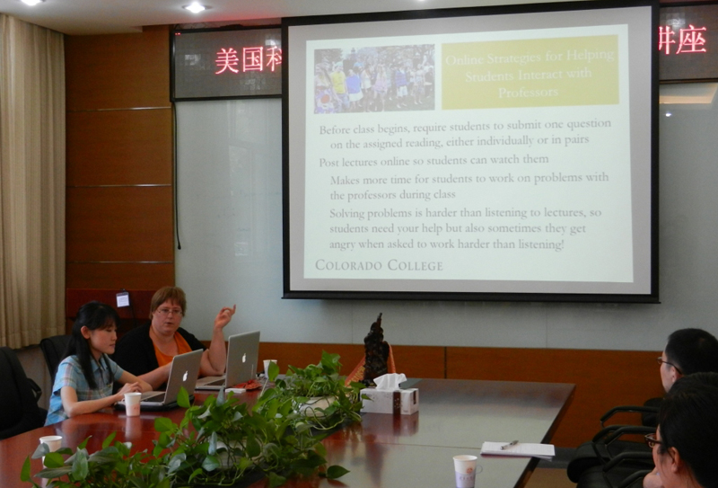 Lostroh教授从科罗拉多文理学院的发展历史、本科专业设置、本科课程设置及评价体系、如何进行互动教学等方面展开了详细的介绍,并以所教授的专业课程为例,细致解读了“翻转课堂”的教学体制,如何进行有效的课堂提问,如何科学地分配讨论组,如何让互动教学更有成效。她的报告视角独特,观点鲜明,见解独到,语言风趣,展现了深厚的理论功底和渊博的学养风范,引发了与会者阵阵掌声和共鸣。