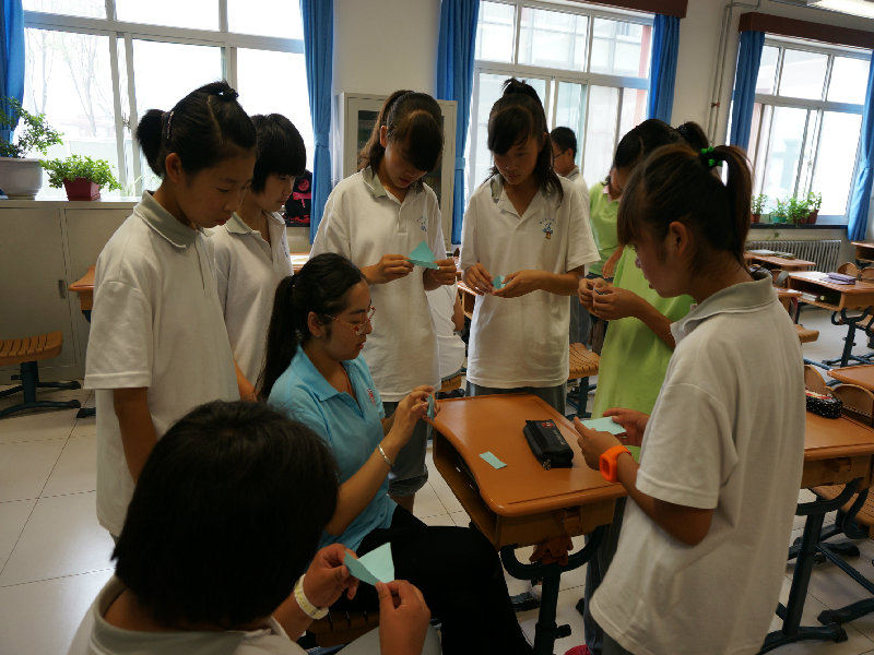 手工组的四名成员带着工具走进了韩村河中学的阶梯教室。实践团成员在向同学们讲解了手工折纸的由来和发展之后,便开始教他们折纸。大家分成小组进行手工展示,各展其长,既有合作又有竞争,场面十分融洽。折纸过程中,不仅完成了既定的教学任务,小同学们还拥有了自己的作品,温婉动人的百合,娇艳欲滴的玫瑰,色彩斑斓的蝴蝶等。同学们把他们的小小作品全部送给了实践团成员,这些不仅是工艺品,更是一座架在实践团成员和同学们之间沟通心灵的桥梁。