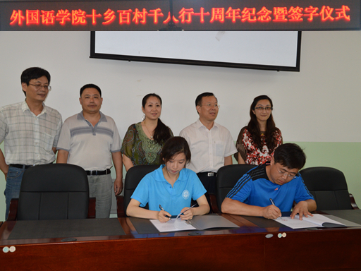 7月7日,外国语学院领导班子全体成员来到交道中学,亲切慰问实践团成员并参加外国语学院“十乡百村千人行”十周年纪念暨签字仪式。