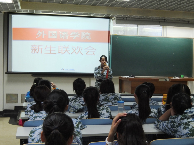 外国语学院组织新生联欢会,女生小合唱、单口相声等节目将联欢会推向一个又一个的高潮。潘悦琪同学以一曲悠扬的葫芦丝曲赢得了同学们热烈的掌声,俆逸凡则为同学们带来了芭蕾舞《天鹅湖》的选段,她优美的身姿使同学们不住地赞叹。英语142班的屈宁鸥与付恩琦则为大家演唱了《good time》,祝愿每一个同学在军训中每天都能have good time,挑战自我,快乐军训,欢快的节奏引起了在场同学们的强烈反响,现场气氛十分热烈。