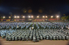 晴空万里,阳光直射地面,气温最高已经达到32摄氏度,这在渐凉的秋季着实是一种煎熬。熬过白天的炎热,晚上相比要凉快许多。各营连齐聚操场,开始一天的合练任务。7:30左右,参谋长正式宣布合练开始。各营方阵迈着整齐的步伐走上跑道,声声口号响彻操场。当每个方阵走过主席台接受检阅的时候,老师和教官频频点头表示赞许。