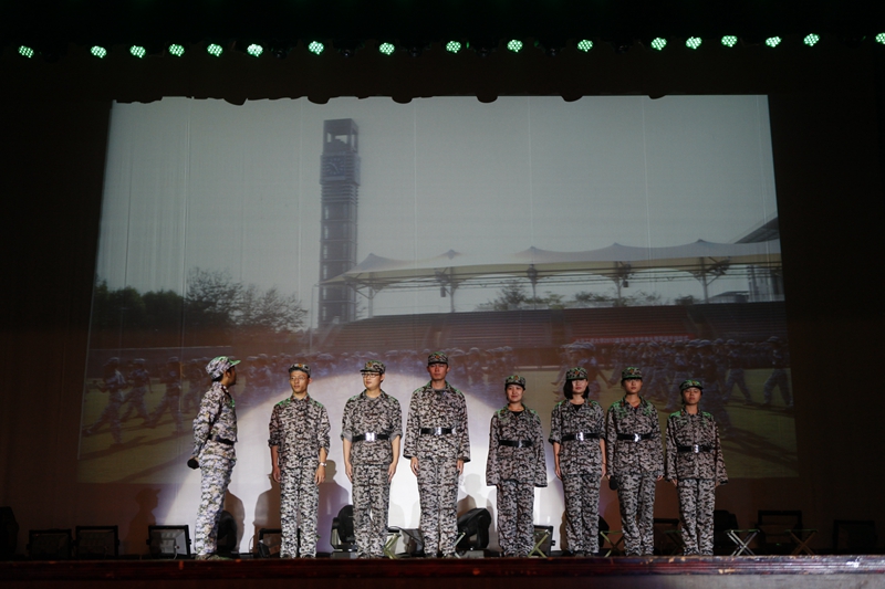 随着全场灯光骤停,军训的号角声再次响起,大屏幕播放着军训视频,2014级新生迷彩精神,以刚毅的步伐,规范的军姿展示青春的风采。一段段详实的视频,掀起了同学们对军训日子的怀念,与对大学新生活的期待,也让老师们感叹新生的意气风发,让学长学姐见识新生的青春风采。伴着管乐团激情昂扬的音乐《藏龙卧虎》,一场精彩的晚会拉开帷幕。