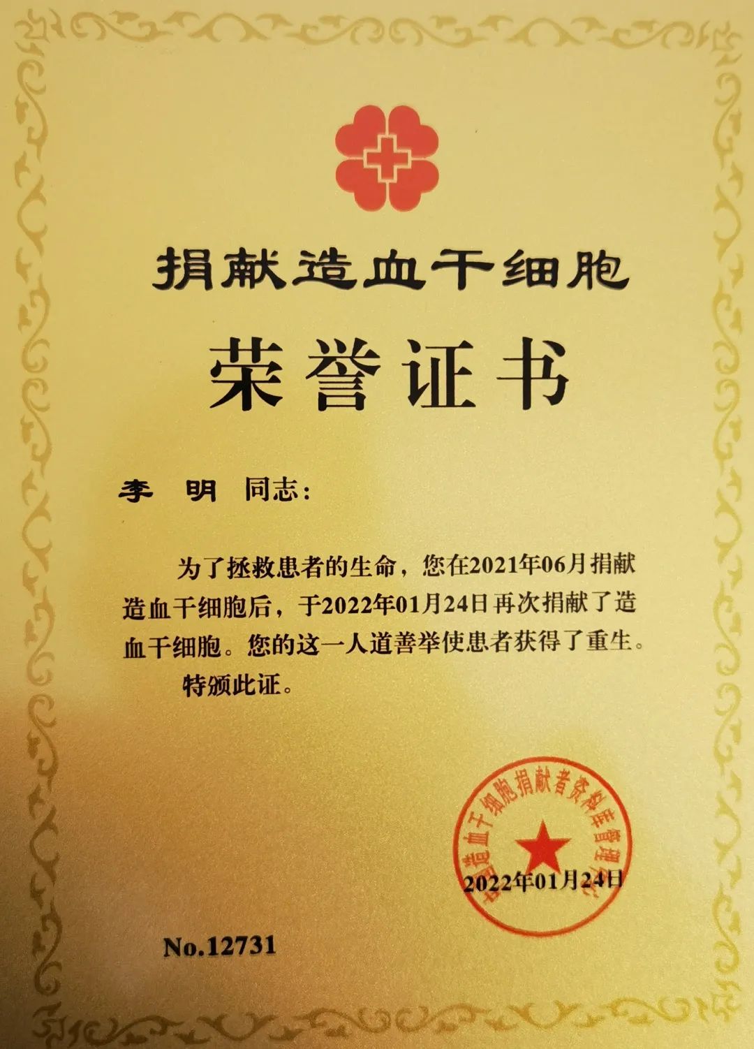 2019年的寒冬,19岁的李明独自走进了马鞍山市大华爱心献血屋,完成了人生第一次献血。恰逢该市红十字会工作人员在宣传造血干细胞捐献的知识,了解到造血干细胞移植对于治疗血液疾病的重要意义后,他毅然加入中华骨髓库,成为一名中华骨髓库志愿者。
