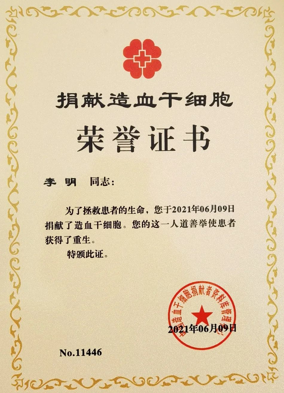 两年后的一个春日,正在工厂测试毕业设计产品性能的李明接到了中华骨髓库马鞍山站工作人员的来电:“您的HLA配型与一名白血病重症患者吻合。”惊讶、忐忑、紧张、欣喜……几种情感瞬间涌上了李明的心头,他深知,配型成功的概率只有万分之一甚至几十万分之一,这几乎是受捐者延续生命“唯一的机会”。李明感到身上有一种为受助者带来生命之光的责任,他当即毫不犹豫地表示:“我同意进行骨髓捐献!”